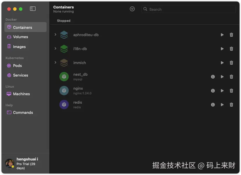 初次运行会拉取对应的镜像文件,注意网络通畅。运行成功后可以在Orbstack中看到启动的对应容器服务: