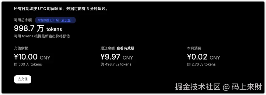 下面是我充值10元后,新增500万tokens
