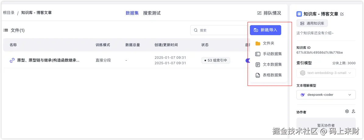 这里本人打算创建一个自己博客的知识库,这样大模型就会首先参考我的博客文章。本来是可以使用web站点这类知识库的,但他是付费功能😂