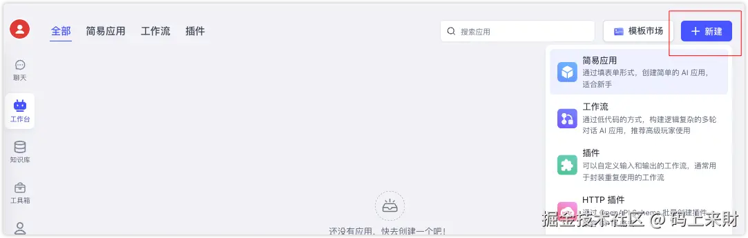 打开 工作台 点击右上角的 新建/简易应用