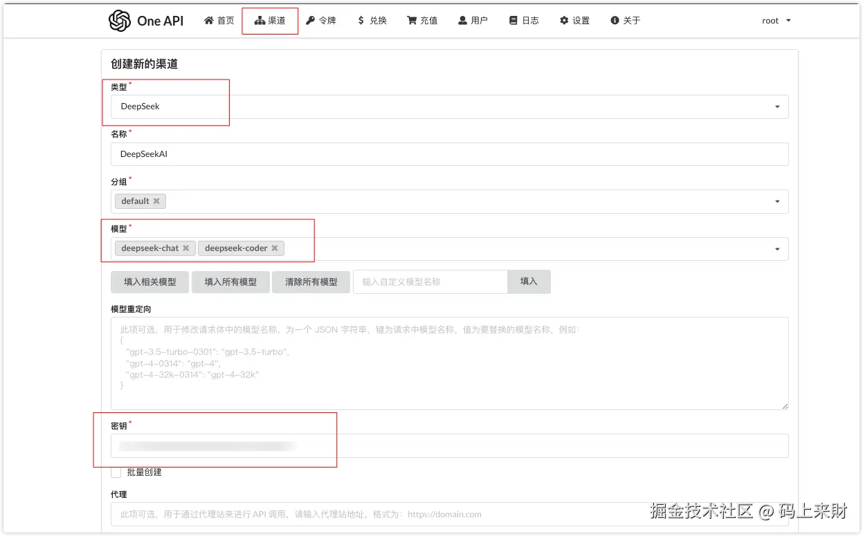 然后点击顶部导航栏的渠道,这里我们要添加的渠道为DeepSeek,选择对应的类型后(你可以查看OneAPI支持的渠道),在模型那里会自动填充渠道默认的模型类别,最后输入渠道对应的令牌(API KEY),然后保存