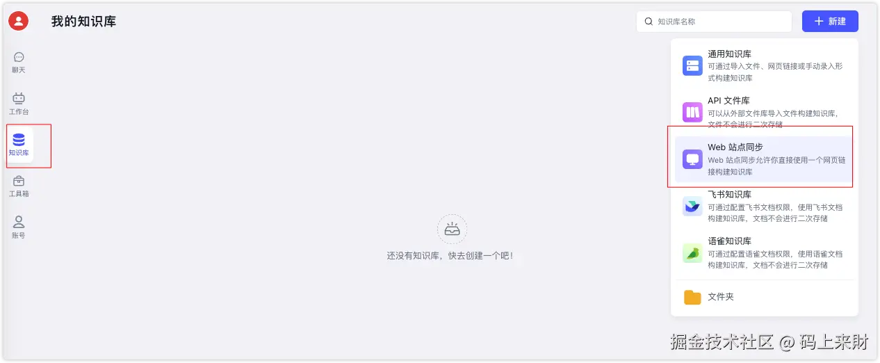 进入左侧 知识库 菜单,点击右上角 新建/通用知识库