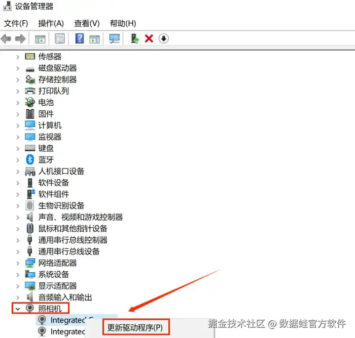 步骤2:右键单击摄像头设备,选择“更新驱动程序”,然后选择“自动搜索更新的驱动程序”。
