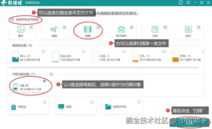 U盘误删的文件怎么找回数据恢复?在使用之前,我们需要将目标U盘连接到电脑里,然后在软件首页上选择U盘即可进行U盘数据恢复的操作。