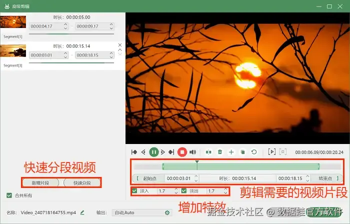 步骤3:录制完成后,你可以直接在软件内进行简单的视频剪辑和后期处理,如快速分段视频等,然后导出保存。
