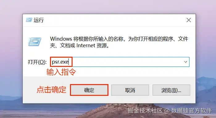 步骤1:按下快捷键“Win+R”就可以唤出步骤记录器了,然后输入“psr.exe”并点击确定。
