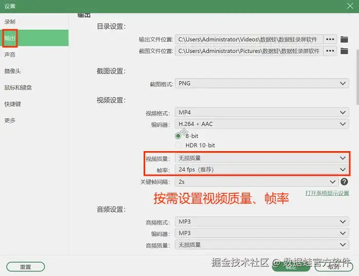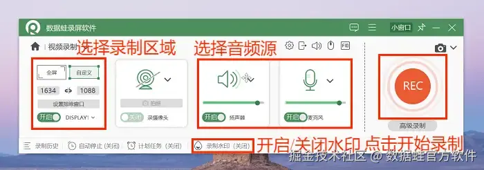 步骤2:可以自定义录制区域、设置视频质量(高质量、无损质量等)、帧率(10fps、20fps、24fps等)等参数。还可以选择关闭水印哦。一切准备就绪后,点击“REC”按钮开始录制。