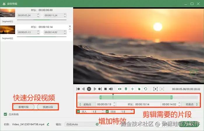 不仅如此,这款免费屏幕录制软件在录制的时候能保证声音与画面同步且清晰,确保录制的视频内容更加完整。而且除了电脑录屏功能外,数据 蛙录屏软件还内置了视频后期处理的功能,如快速分段、合并视频、添加视频特效等,使视频内容更加丰富。