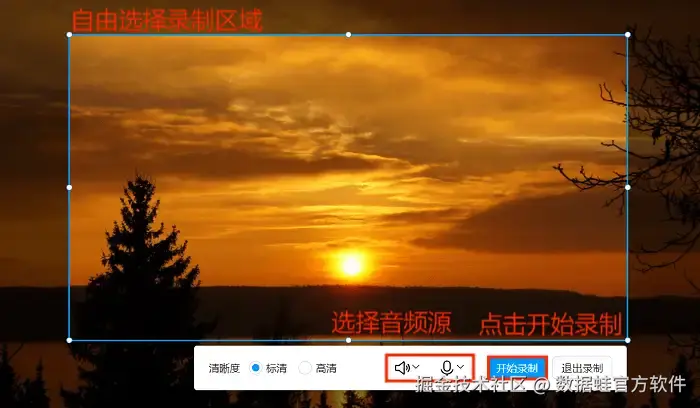 步骤2:自由框选出录制的区域和音频源,然后点击“开始录制”按钮。