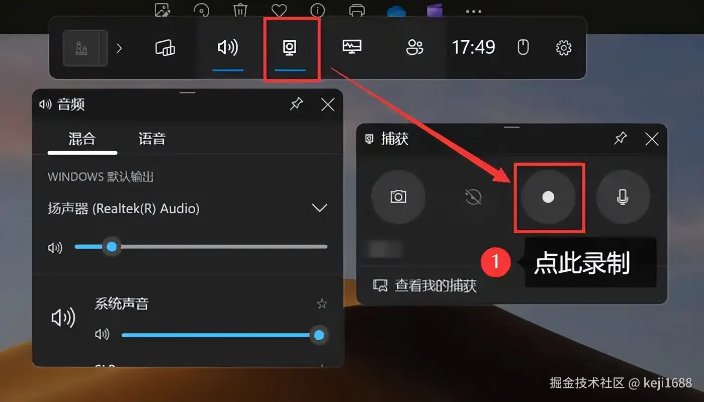 步骤1:按下 【Win+G】 组合键,打开Xbox Game Bar。点击 【录制】 按钮,即可进行录屏。