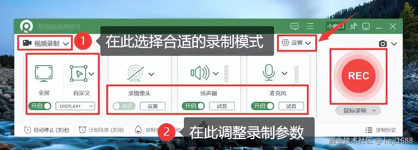 步骤1:在电脑上打开录屏软件,根据录制内容选择所需的录屏模式,并可自由调整摄像头、扬声器、麦克风等参数。