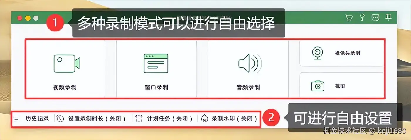 步骤1:打开软件,在首页中选择合适的录制模式,并可自由调整录制时长、设置计划任务、以及修改录制水印等内容。