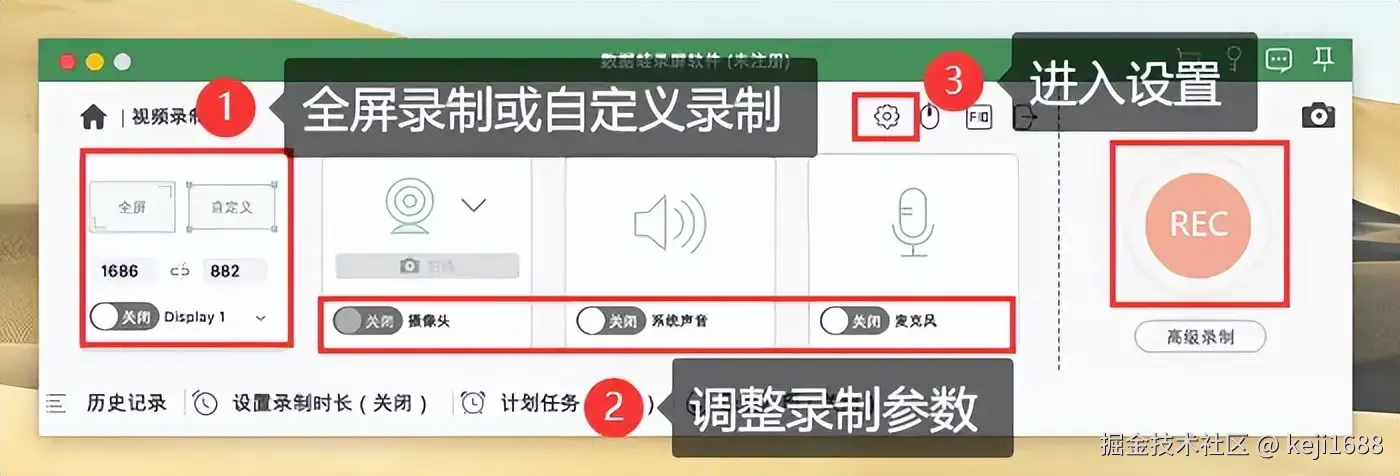 步骤2:框选好录制区域,勾选 【系统声音】 和 【麦克风】 选项以同时录制声音。在录制参数设置中,自由调整录制格式、质量、帧率等内容。点击 【REC】 进行录制。