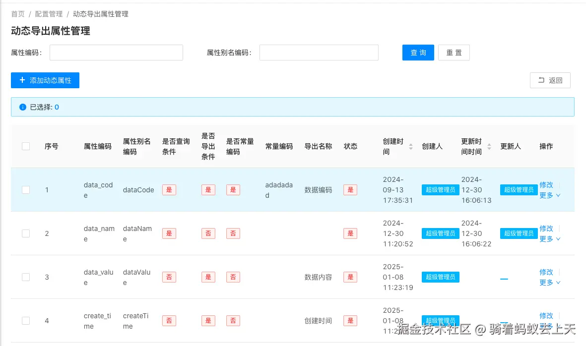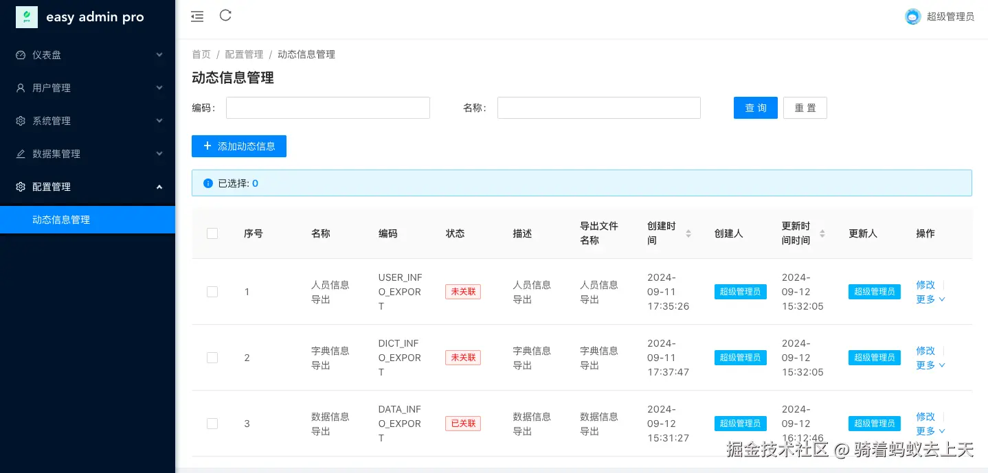 在项目上实现一个导出功能往往需要进行一定量的代码开发,但如果能够使用一个通用的导出功能那么将会事半功倍,本人基于easyExcel实现了一个前后端分离的通用导出功能(仅适用于单表,多表关联导出后续将再实现),此功能通过配置信息引用编码及传入查询条件/不传入查询条件实现数据导出到excel表格。