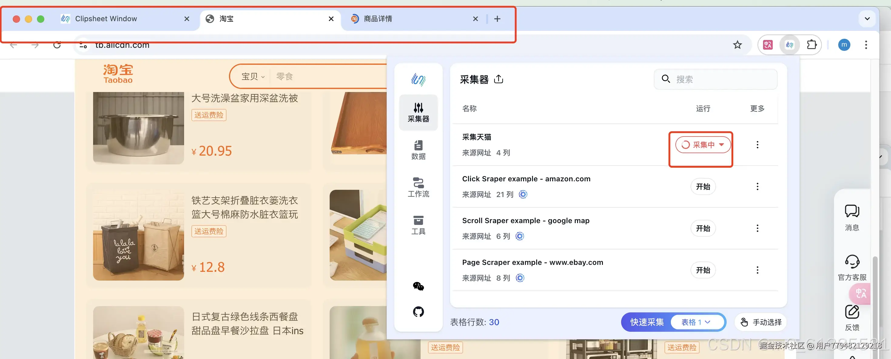 安装插件成功后,以CSDN的文章列表页blog.csdn.net/?spm=1001.2…作为展示, 可以看到Clipsheet插件已经在该网页中自动检测到 4 个表格,此时插件内 快速采集 的按钮也是高亮的, 直接点击按钮就可以通过插件采集到我们的第一个表格