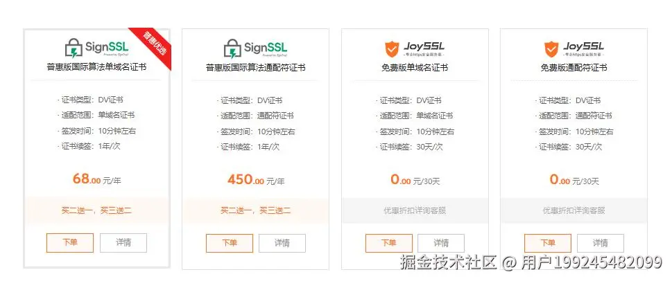 在证书申请页面,会展示出 JoySSL 提供的多种证书类型。仔细浏览,找到 “SignSSL 普惠版国际算法证书”;