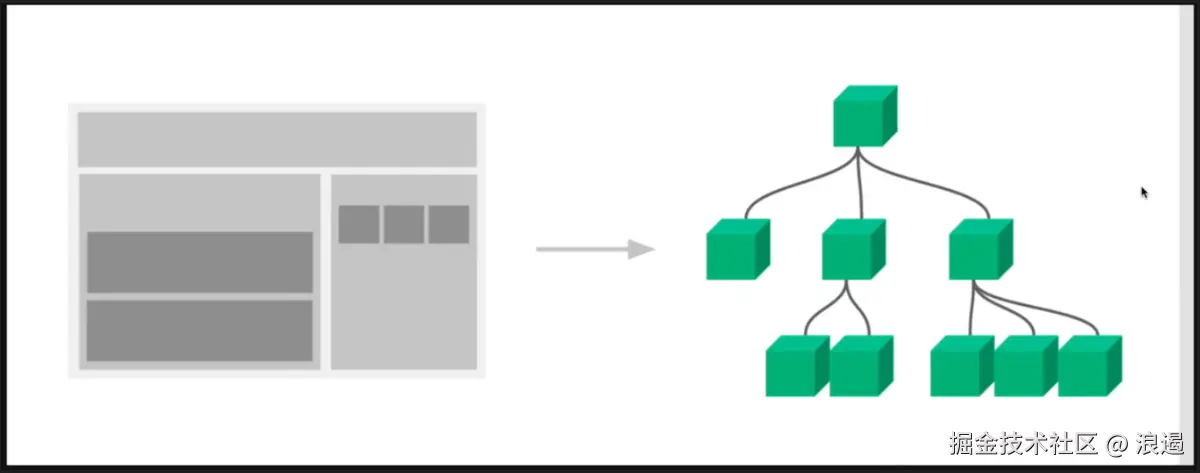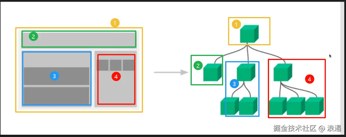 一个实际的页面,将其组件化后得到了一棵包含多个组件的组件树。比如,一个常见的网页布局包含顶部的导航栏、侧边栏、主体内容区域等部分。