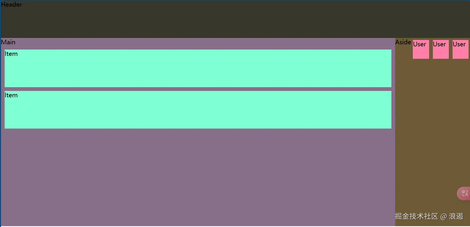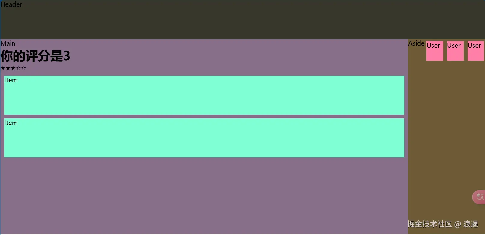 aside标签,内部包含三个User组件,使用在App组件中定义的flx类进行布局,使User组件在侧边栏中按一定方式排列。