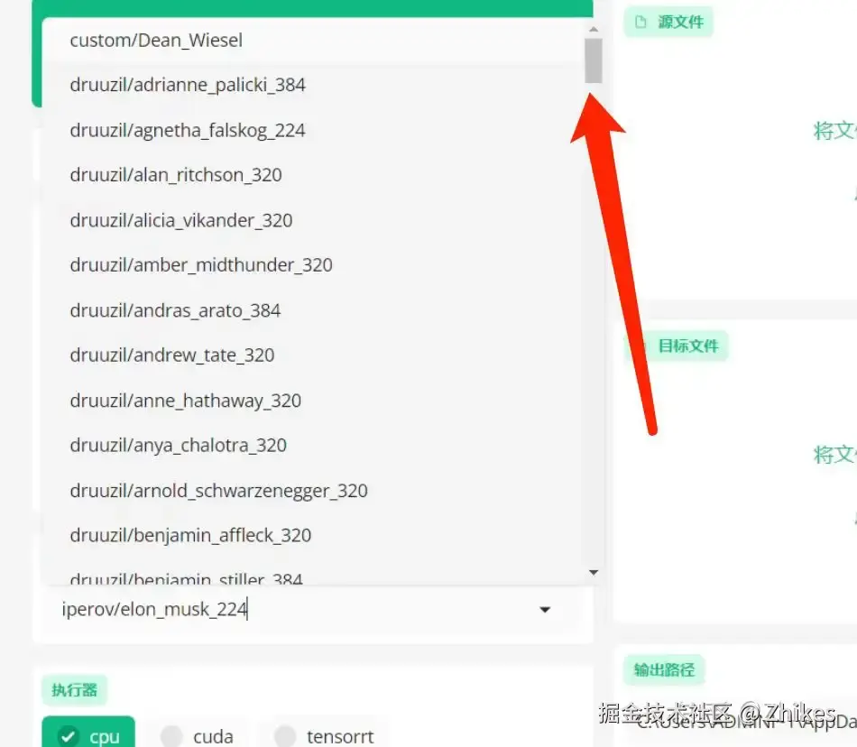 在深度换脸模型选项栏中,点击选择框并拉到最顶部,选择你放入 custom 文件夹中的 DFM 模型名称。