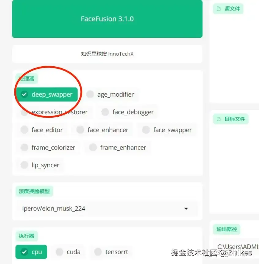 在 FaceFusion 界面中,选择处理器 deep_swapper。
