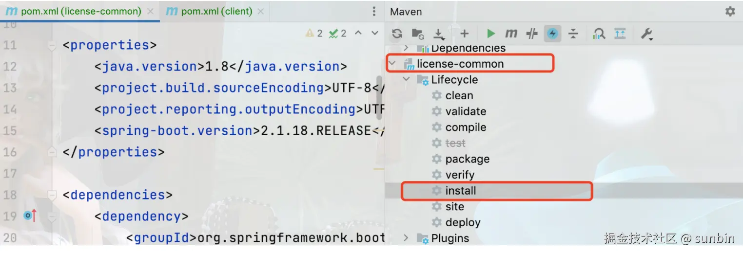 pom.xml中加入以下内容text 代码解读 复制代码 <dependency> <groupId>com.zuiyu</groupId> <artifactId>license-common</artifactId> <version>0.0.1-SNAPSHOT</version> <scope>compile</scope> </dependency>完整的核心