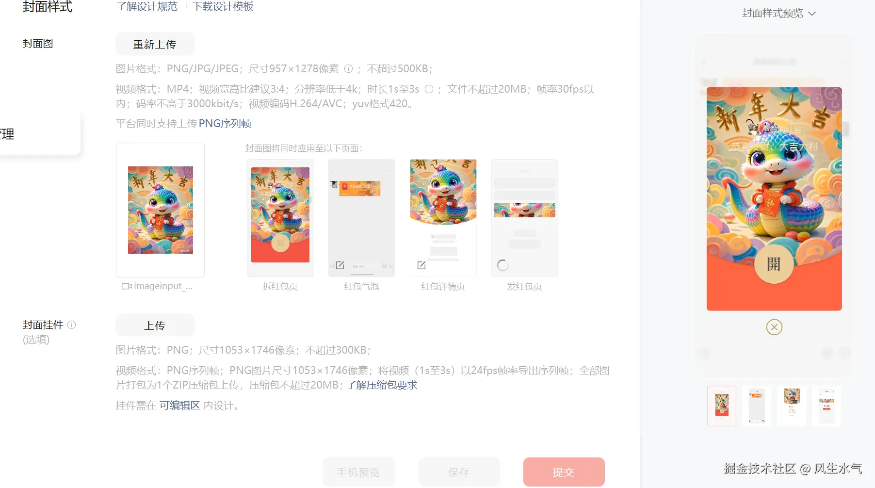 对于一般的用户来说,如果只是需要静态的红包封面,那么到这一步就可以结束了。但如果我们想制作一些动态的视频封面,我们需要进一步使用AI工具将静态的图片转换为动态的视频。我们可以将上面的图片进行导出,用其他工具进行创作,也可以进一步使用当前工具进行创作。下面是示例的呈现效果。