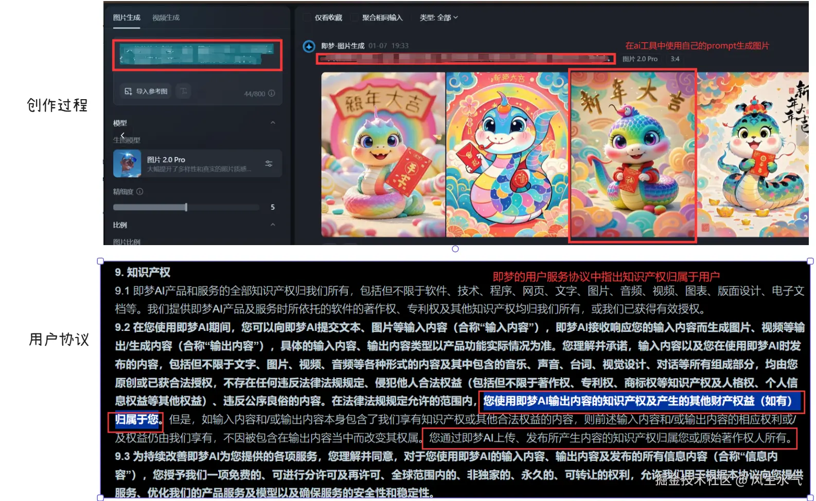 要制作自己的红包上传到平台,一般来说平台会进行审核。那么对于我们使用AI工具制作的内容来说,我们要准备哪些内容呢?我理解答案是:创作过程和用户协议。 创作过程证明了是你在创作,用户协议则是工具允许你创作的内容归你所有。因此,我们需要准备这两个内容。在对应的创作截图中,我们要用高亮区域标注出相关内容进行说明。最终这一步的产出物是多张证明图片(或者你可以把这些图片放到一起,这里只是示例)