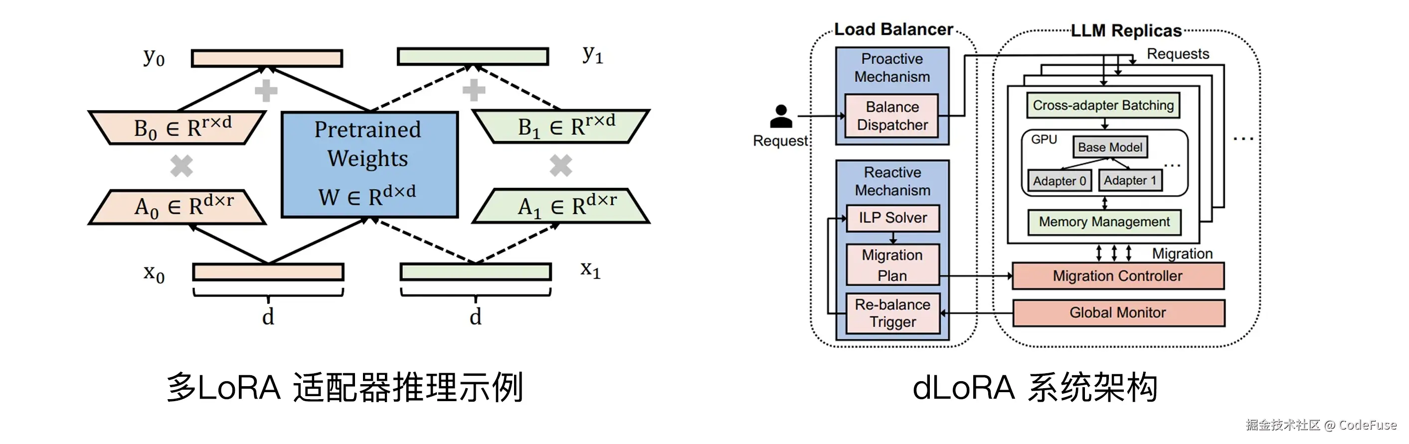 具体来说,对于单个模型实例,dLoRA 采用动态批处理技术,根据请求到达模式和当前系统状态,在多 LoRA 推理和单 LoRA 合并推理之间动态切换,以降低队列延迟。在集群方面,dLoRA结合主动和被动机制来解决副本间的负载不平衡问题。主动机制根据工作负载模式预测性负载请求分配到副本,并预加载LoRA负载,负载机制则通过请求和负载协调迁移算法,在检测到负载不平衡时迁移请求和负载,以实现负载内的负载均衡。
