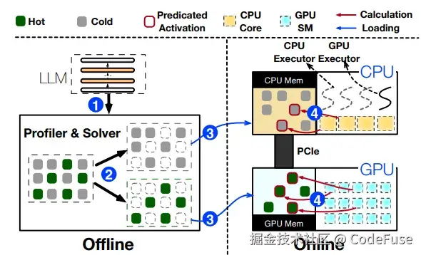 LLM在自然语言任务处理中表现出色,但由于巨大的参数量,在消费级GPU上部署面临着明显存在不足的挑战。现有的方法,比基于卸载的方案,将模型参数卸载到CPU上并且动态地加载到GPU中进行计算,会导致很多模型参数传输的开销。而GPU-CPU混合推理(如llama.cpp),虽然在GPU和CPU上同时进行计算从而减少推理延迟,但仍然需要计算所有的模型参数,导致延迟不够理想。为了解决这些问题,论文提出PowerInfer,一个可以在单个消费级GPU上实现高速LLM推理的系统。
