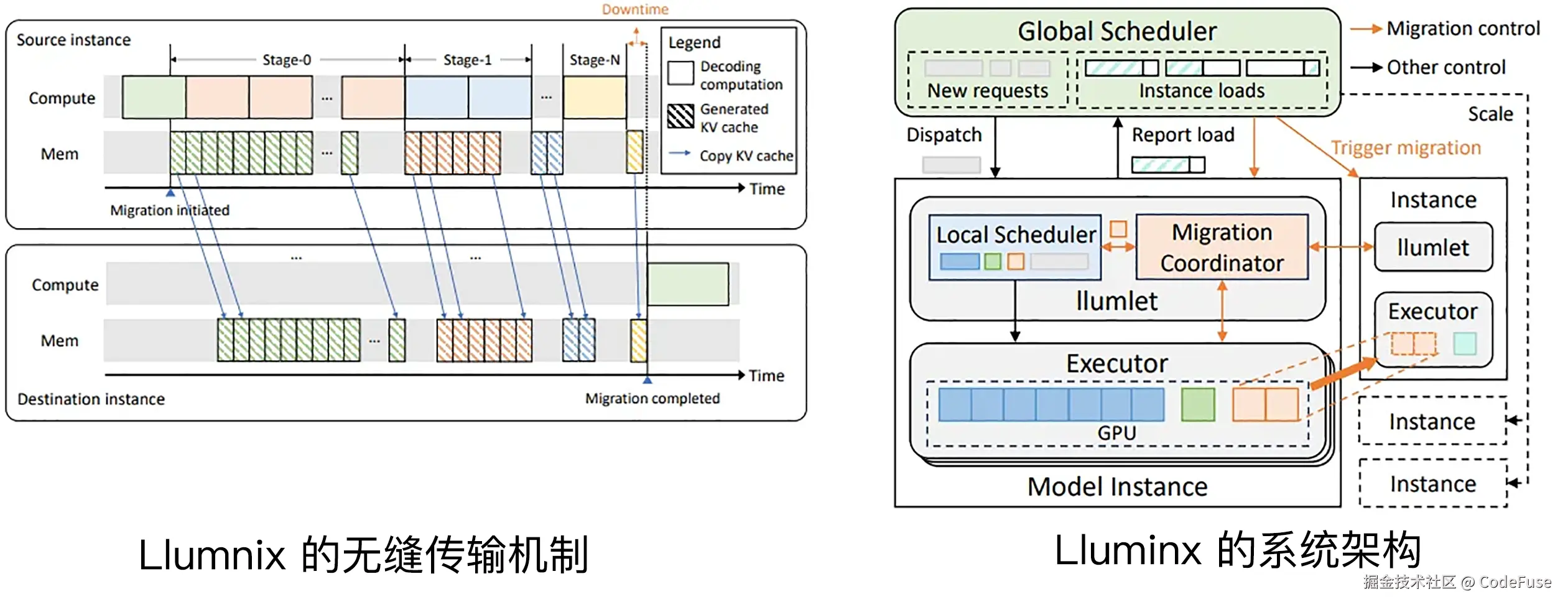 具体来说,Llumnix的迁移机制首先在迁移目标实例上初始化显存资源,然后将源实例上的KV Cache逐步迁移到目标实例,在迁移的过程中,源实例仍然在对请求进行处理,不断生成 Token,由于迁移单个 Token 的时间很快很快就小于计算生成单个 Token 的开销,因此在少量迭代内 KV 缓存就可以被迁移完成,之后请求将在实例目的上继续处理,从而达到无缝迁移。除此之外,Lluminx通过虚拟资源占用,为高优先级的请求,队首的请求设置更高的虚拟资源占用,通过在多个实例之间通过无缝请求迁移实现虚拟资源占用的负载均衡,从而达到请求优先调度的目的并解决多实例的显存碎片的问题。