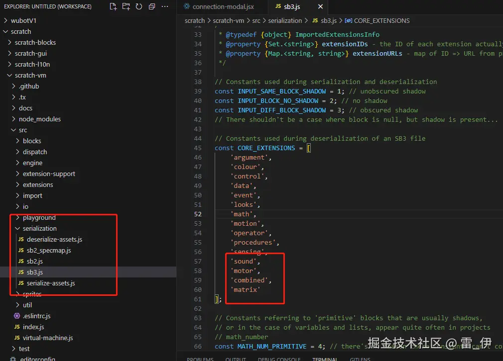 注意:对新建的blocks的命名时不能随便命名的,不然会影响文件保存功能。要在scratch-vm中src/serialization的sb3.js和sb2.js中添加新建的块的类别,