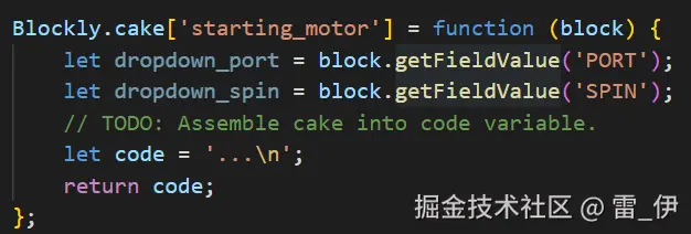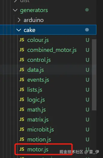 (2)然后在在 scratch-blocks/generators 下找到想要生成的代码类型,比如 c 语言,我这里定义 cake 文件,新建一个 motor.js 文件,然后在内部添加生成块的代码定义