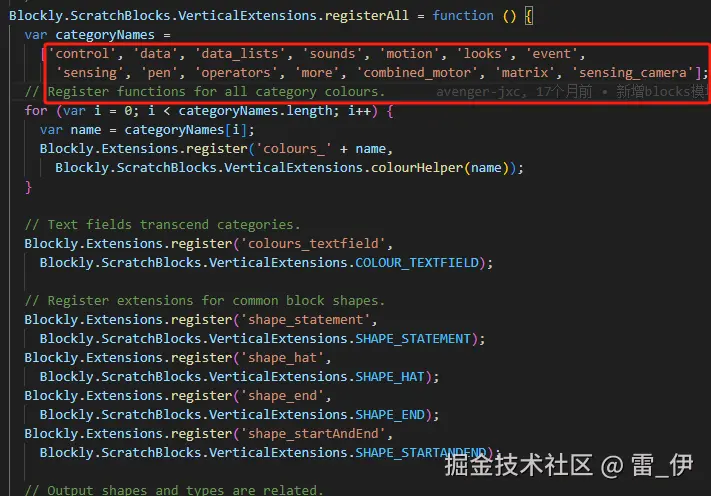(6)要在scratch-blocks/blocks_vertical/vertical_extensions.js中注册,这样才可以用colours_类别名