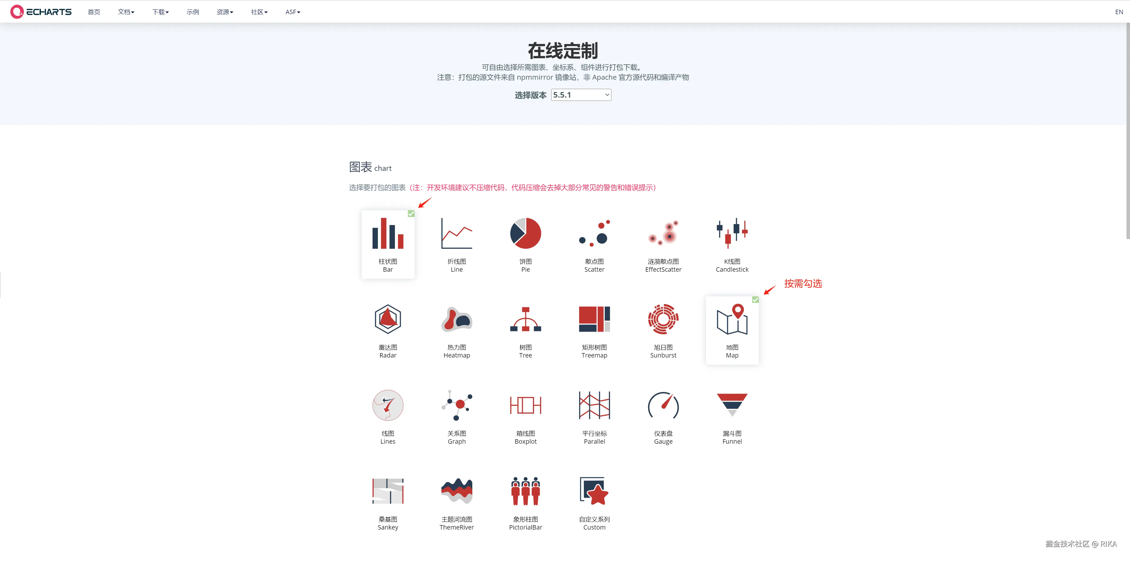 在ECharts官网在线定制echarts.min.js,并下载导入到项目的src\static\echarts文件夹中(src\static文件夹也可以,看个人习惯)。因小程序要求精简,完整下载echarts.min.js大小1KB以上,太大了,只勾选项目用得上的即可。