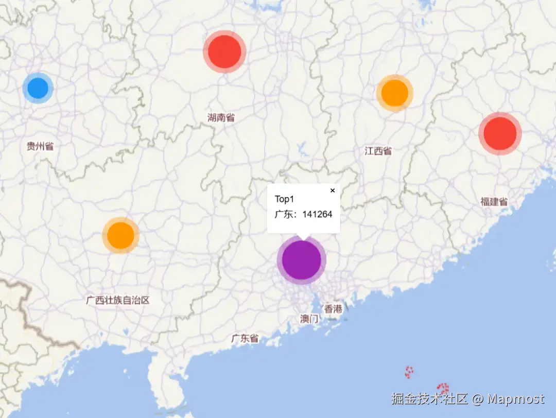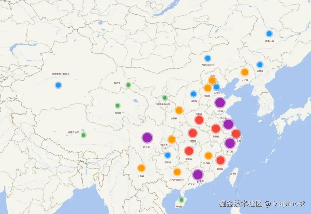 map.addLayer接口,添加了一个circle类型的图层。利用step表达式,我们根据GDP数值范围设定了不同的点样式,从而为每个梯队分配了独特的大小和颜色,以区分各省份的经济表现。// 添加数据源 map.addSource("points", { type: "geojson", data: "./points.geojson", });