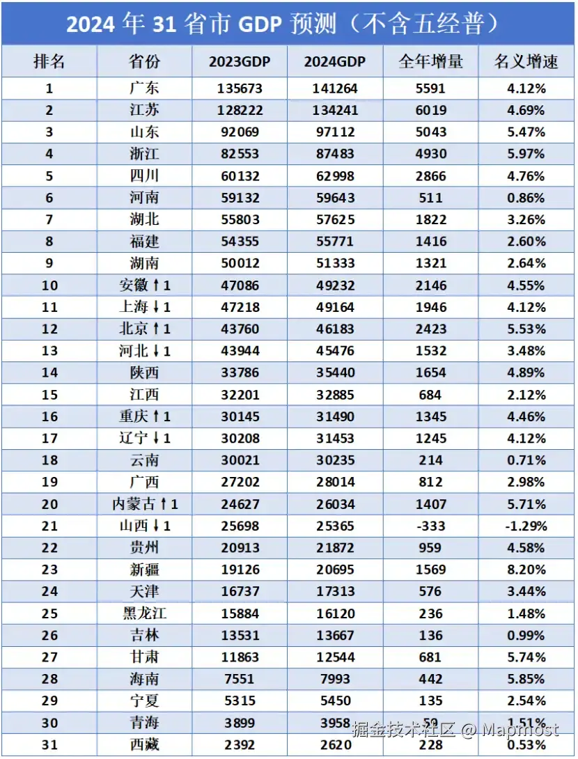 该图通过静态图标直观展示了2024年全国各省GDP预测排名情况,并将31个省份划分为三个梯队,每个梯队采用不同的图标进行区分。