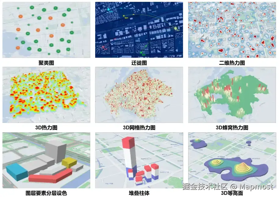 本篇教程为大家展示了Mapmost SDK for WebGL的数据可视化能力,作为面向开发者的Web端三维地图开发引擎,平台还提供包含点、线、面、蜂窝、热力等几十种数据可视化类型,支持百万量级数据渲染。