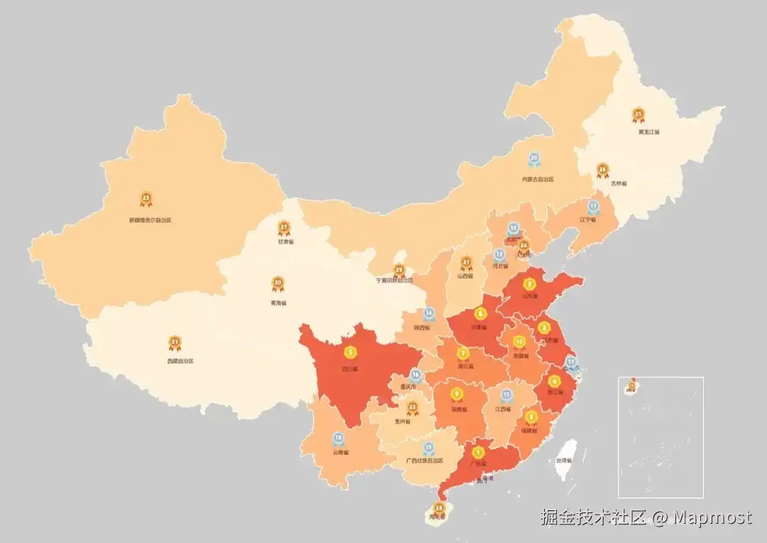 map.loadImage和map.addImage方法加载自定义图标。随后,再次通过map.addLayer接口添加一个类型为symbol的图层,并利用match表达式为每个省份指定相应的图标,从而清晰地展示了各省份的GDP预测排名情况。// 图标路径数组 const iconPaths = ['./icons/icon1.png', './icons/icon2.png', ..., './icons/icon31.png'];