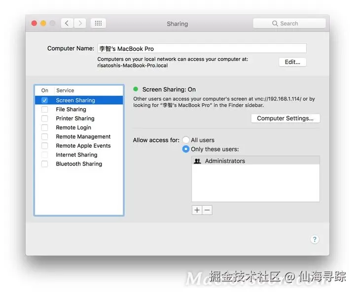 进入之后,选中左侧栏中Screen Sharing前面的checkbox,这样就启动Screen Sharing功能了。