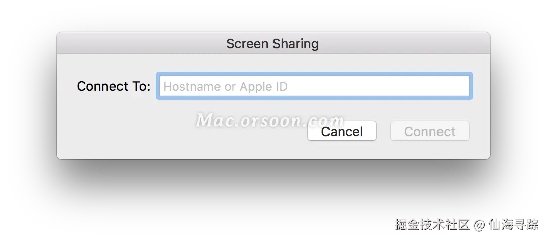 如果想启用远程协助,在Spotlight中输入Screen Sharing打开,会出现一个输入框,需要输入对方的Apple ID。之后就能进行远程协助了。