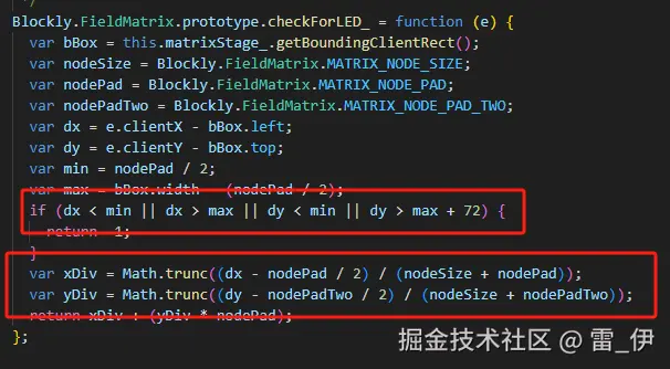 scratc二次开发-修改矩阵灯模块 雷_伊 2025-01-08 150 阅读1分钟 修改矩阵灯模块 (1) 如果要把矩阵灯修改成88、79,就要在scratch-blocks中的core目录下找到field_matrix文件,先修改需要用到的常量: (2) 然后修改生成矩阵灯的地方,根据行列数修改循环,地方有两个,一个是预览的矩阵灯,一个是使用的矩阵灯: (3) 然后根据行列乘积修改灯的数值范围: (4) 最后修改检查鼠标坐标是否与矩阵节点冲突的checkForLED_方法: