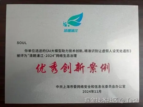 近日,“清朗浦江·2024网络生态治理总结活动”在上海举行。此次活动由上海市委网信办主办,旨在推广网络综合治理实践经验,推动网络生态向善发展。活动期间,上海市网络协同治理联动机制成员单位、区级网信部门、属地互联网企业等42家单位共选送了74个案例,经过层层遴选,最终评选出15个优秀案例。其中,Soul App创始人张璐团队的“AI大模型助力技术创新,精准识别让虚假人设无处遁形”案例成功入选。