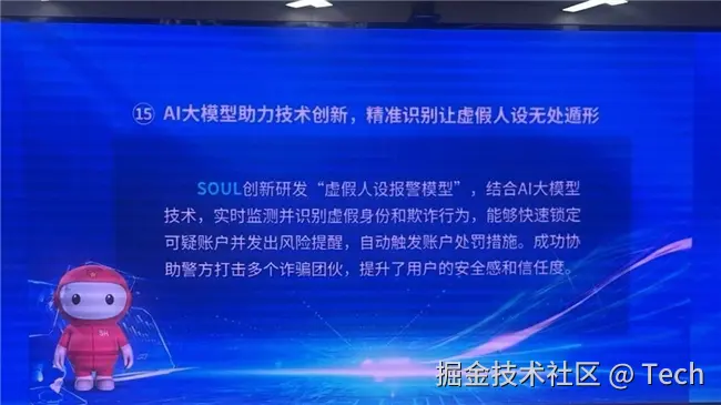 通过本次活动的案例展示,可以看出,网络生态治理已经成为当前社会发展的重要议题。近年来,针对年轻用户群体的网络诈骗手段日益复杂化,网络空间的治理也不能再仅仅依赖传统手段。在此背景下,Soul其风控和画像团队在技术创新方面展开了深度探索。他们研发的“虚假人设报警模型”基于AI大模型技术,能够通过多维度的数据分析,快速识别出虚假身份,提升平台的治理效率。