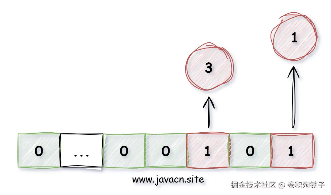 其中下标用来标识具体的数字,例如以上图片标识 1、3 数字存在,如果值为 0 表示不存在,这样的话 40 亿占用的位数组空间位 40 亿 bit,也就是 4000000000/1024/1024/1024/8=0.465 GB,不到 1G 的内存就可以存储 40 亿 QQ 号了,查询某个 QQ 号是否在线,只需要看这个 QQ 下标对应的位置是否为 1,1 表示存在,0 表示不存在。