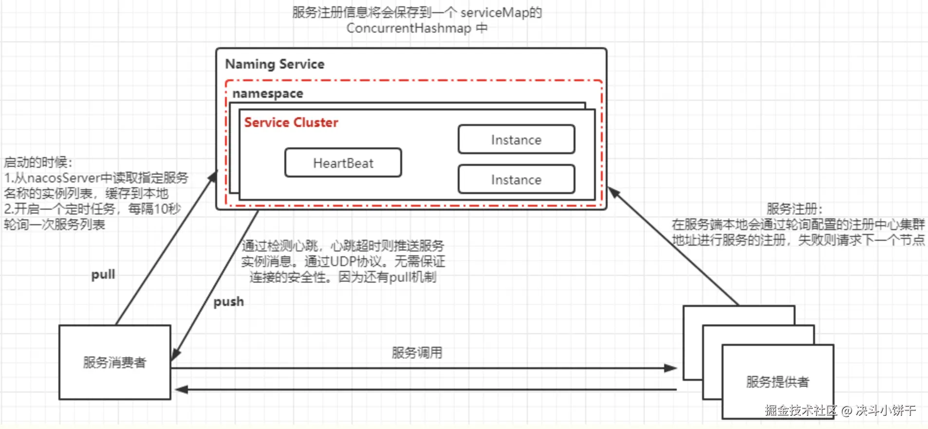 Nacos采用了Pull和Push同时运作的方式来保证本地服务实例列表的动态感知。服务消费者通过定时任务的方式每10s Pull一次数据,Nacos Server在服务提供者出现变化时,基于UDP协议PUSH更新