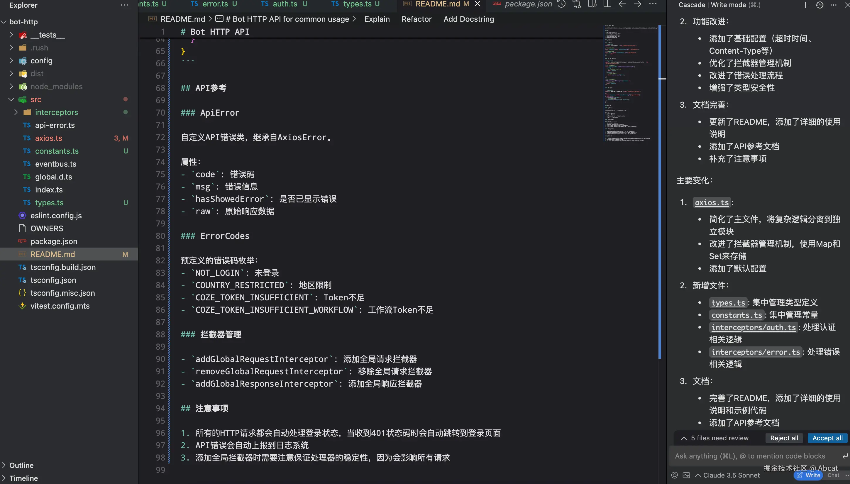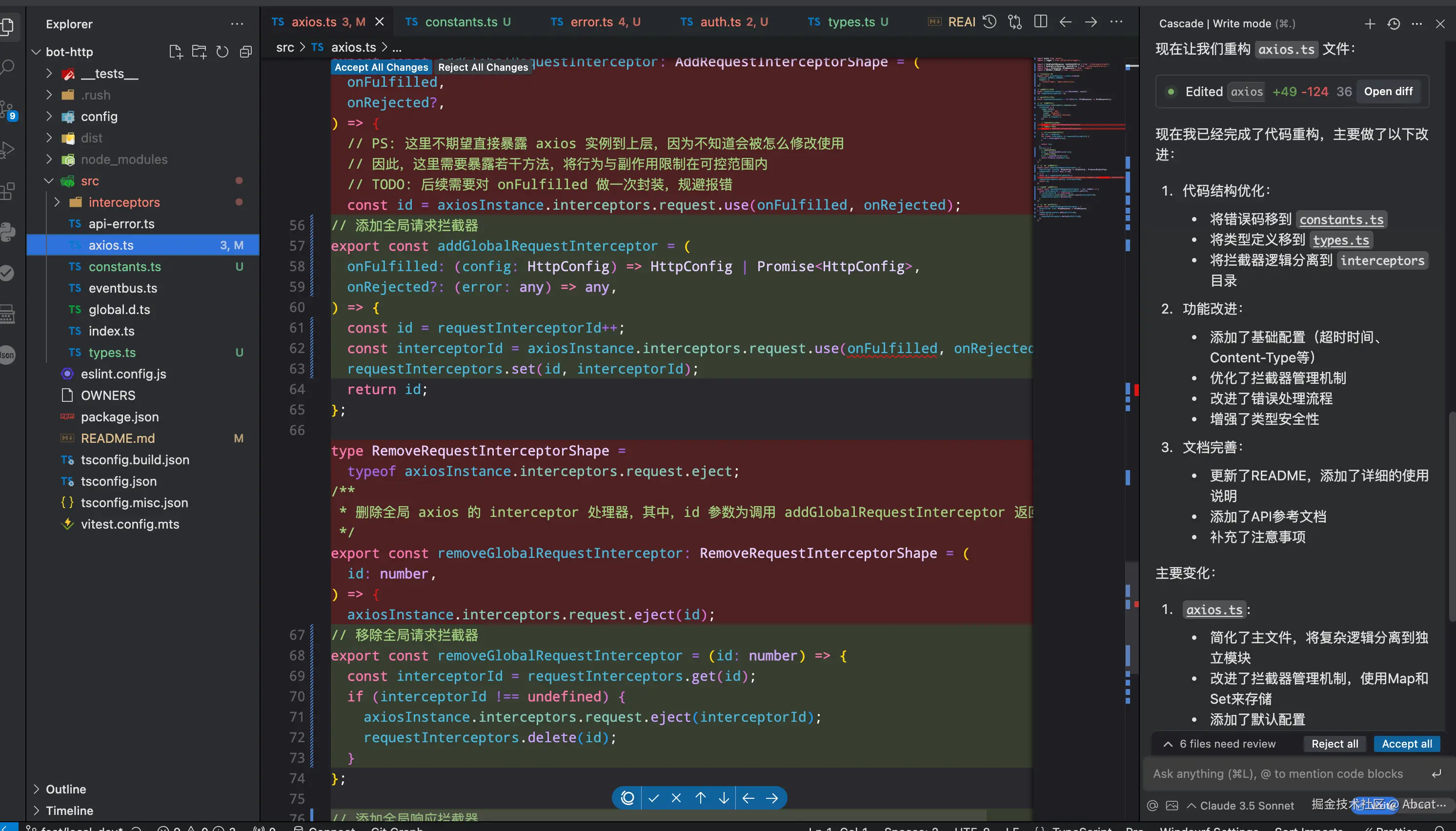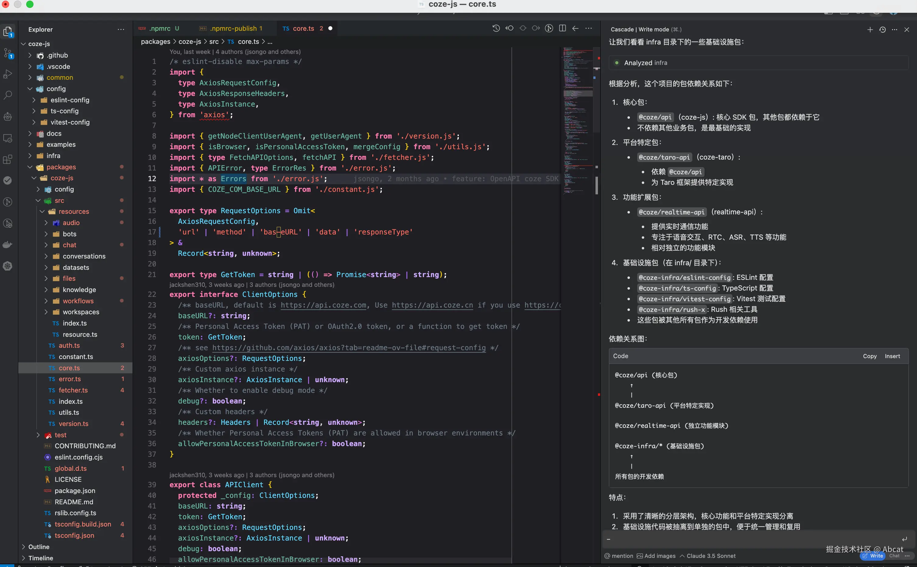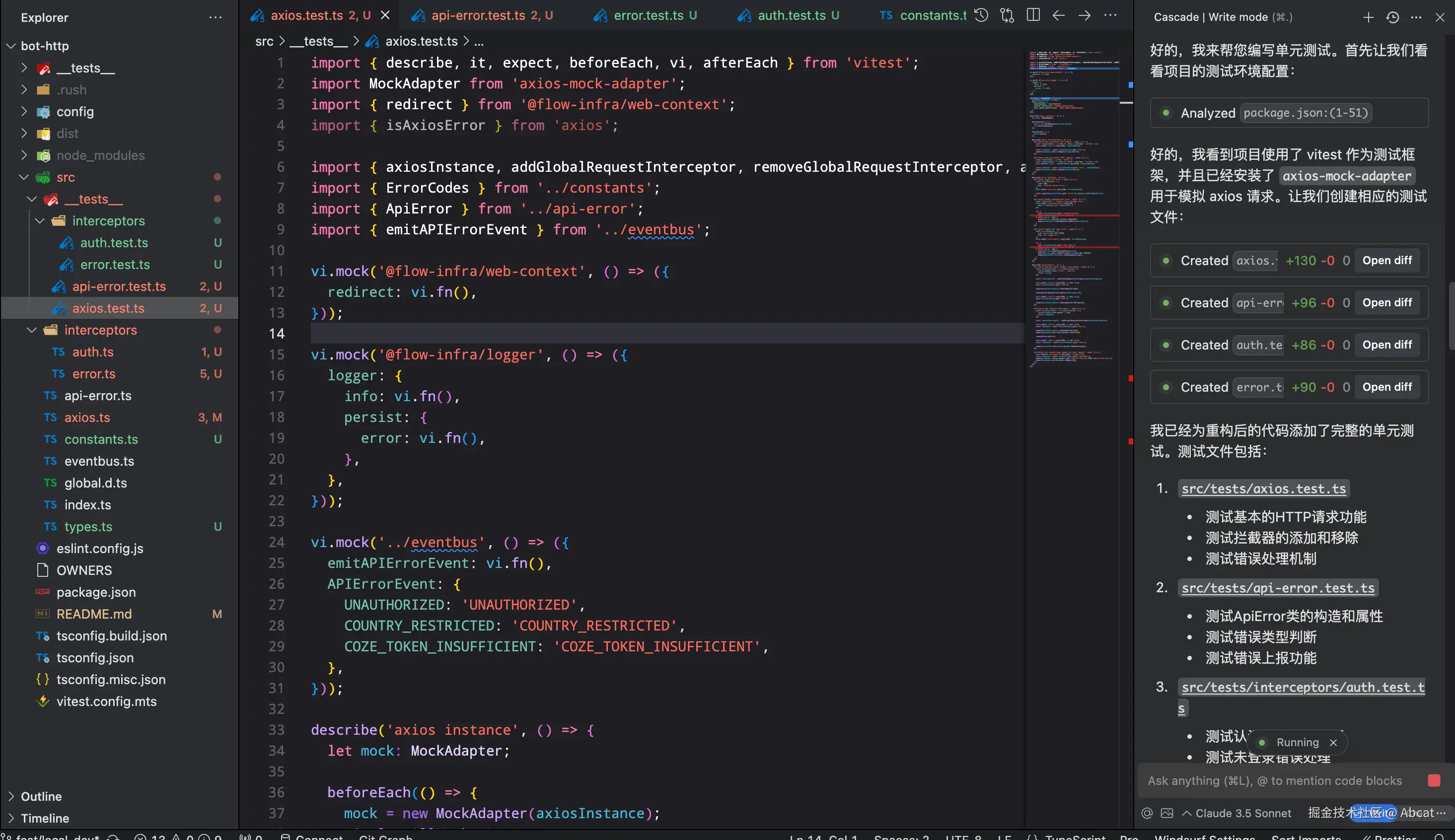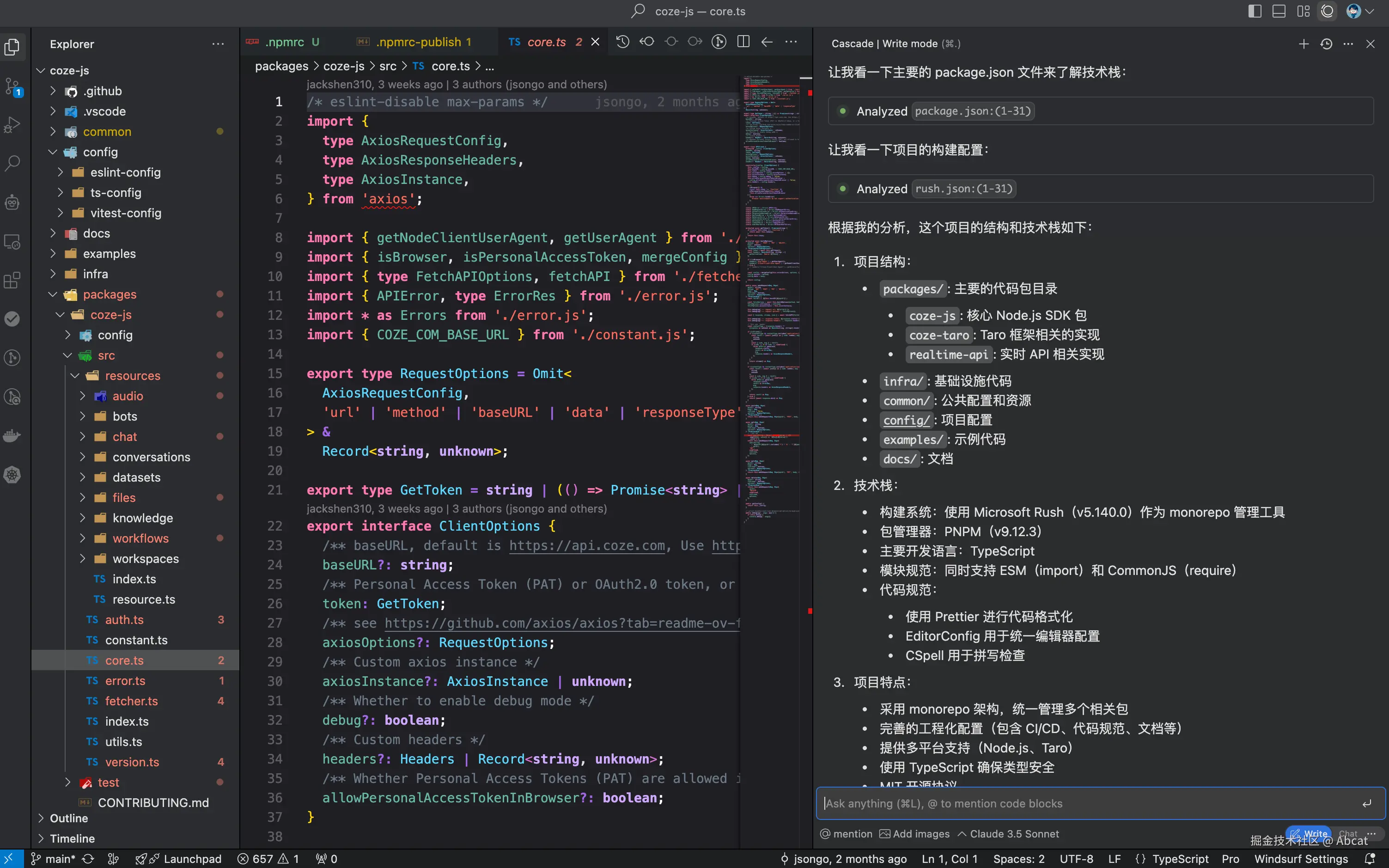 - Cascade 交互演示: 以构建前端依赖库为例,首先用 Chat 模式分析现有工程的基础配置,然后用 Write 模式将构建工具从 tsup 迁移到 Vite,全过程仅需人工进行修改确认,无需编写任何代码。此外,在遇到执行错误时,系统能够自动进行修复,直到构建成功为止,样不仅提高了效率,还大大简化了迁移过程。