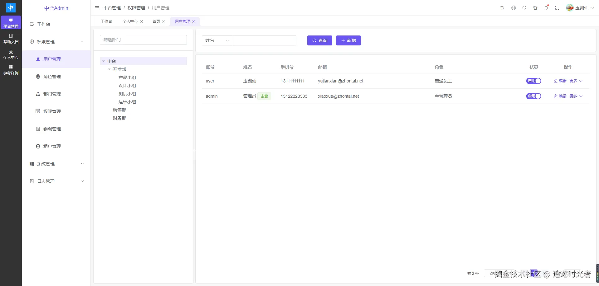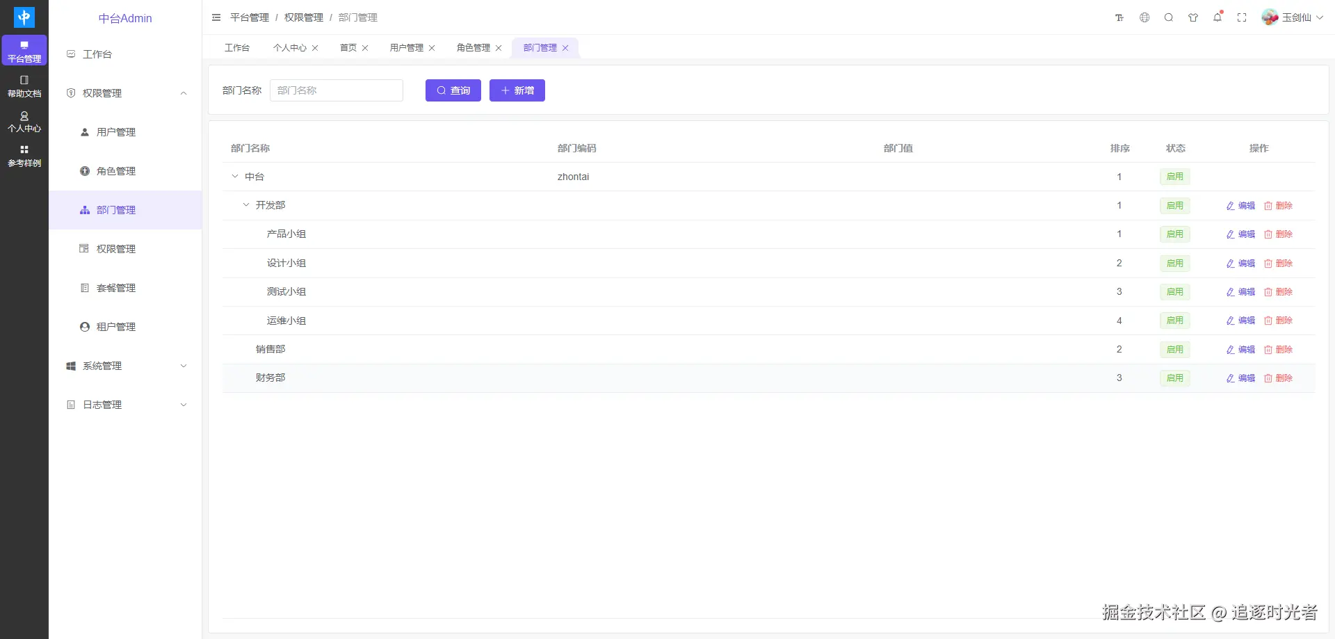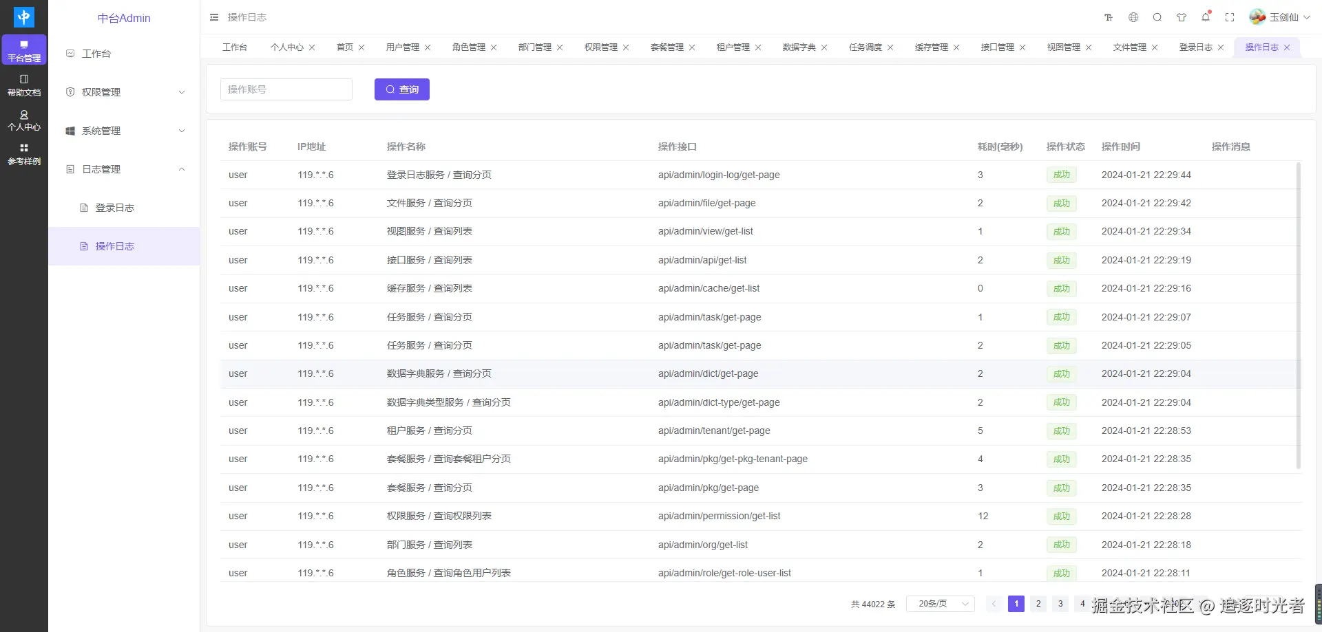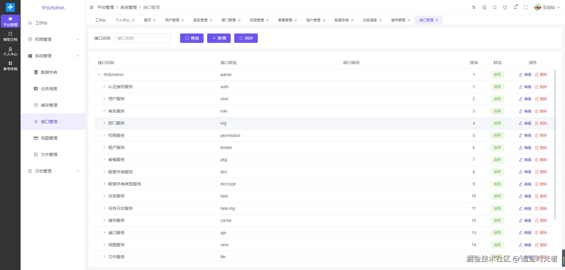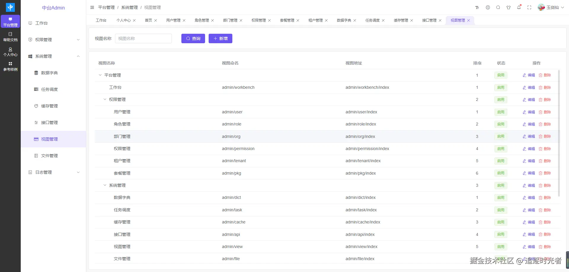 中台Admin后台权限管理系统包括如下模块:用户管理、角色管理、部门管理、权限管理、租户套餐、租户管理、字典管理、任务调度、缓存管理、接口管理、视图管理、文件管理、登录日志、操作日志。
