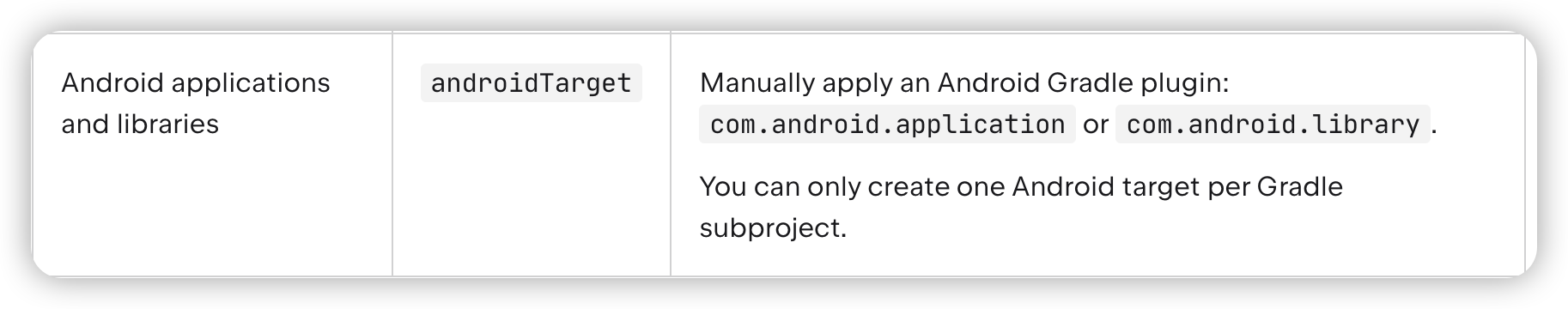 | Android applications and libraries | androidTarget | Manually apply an Android Gradle plugin: com.android.application or com.android.library.You can only create one Android target per Gradle subproject. |