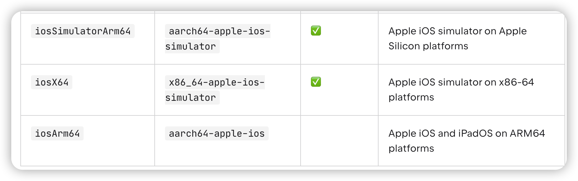 这里可能有好学的同学会问,配之前怎么知道支持哪些平台?iosX64,iosArm64又代表了哪些平台?下面我们来一个一个解答.