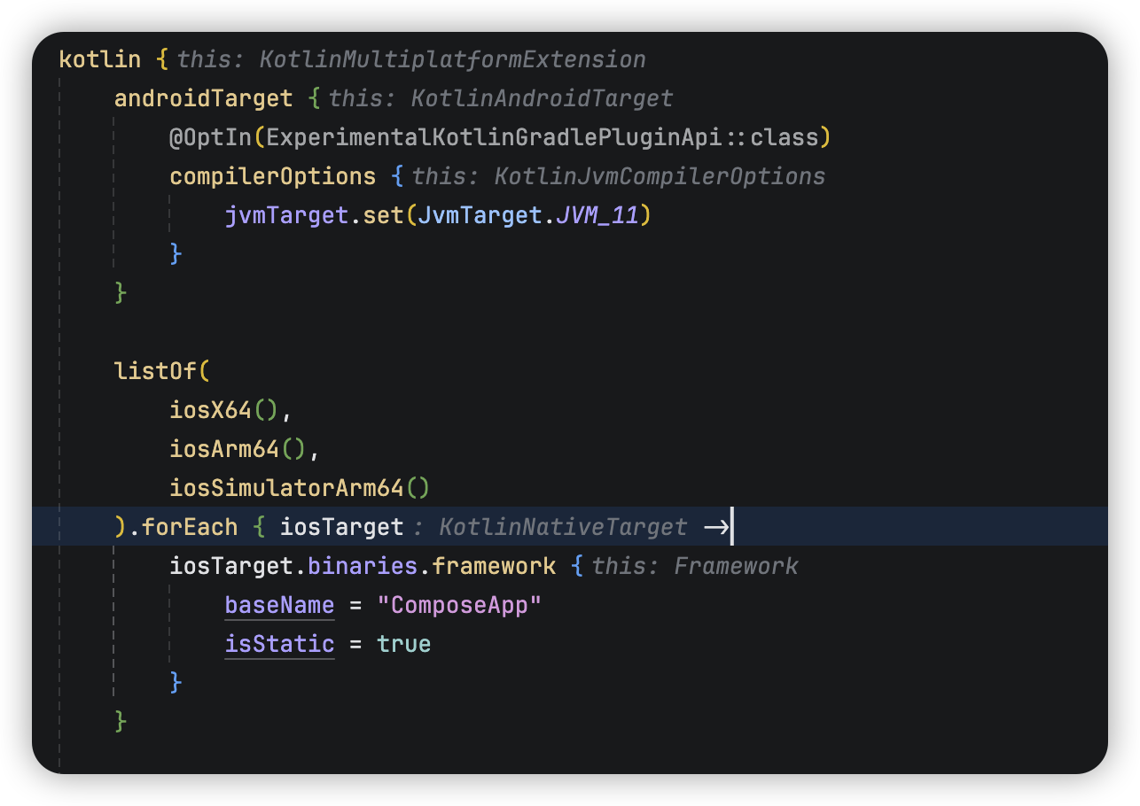 如图所示,我们在应用模块的gradle中,通过kotlin{}代码块来预定义所需的平台.